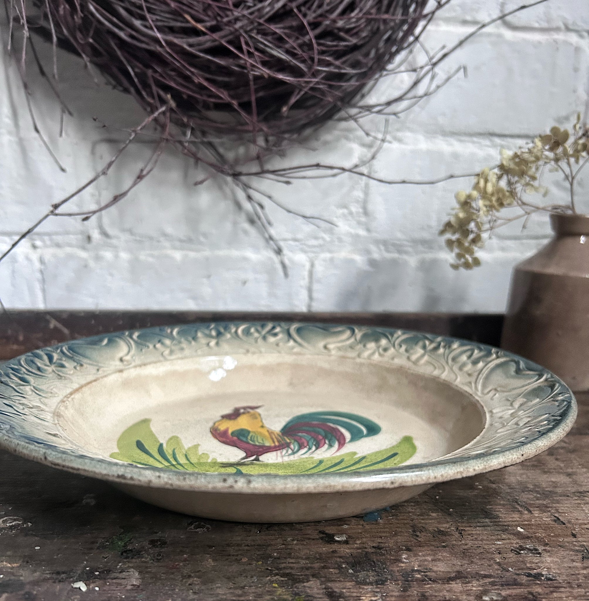 The hand painted rooster is edged with a blue organic art noveau design around the edge of the dish. There is a small hair line crack in one area which is reflected in the price.