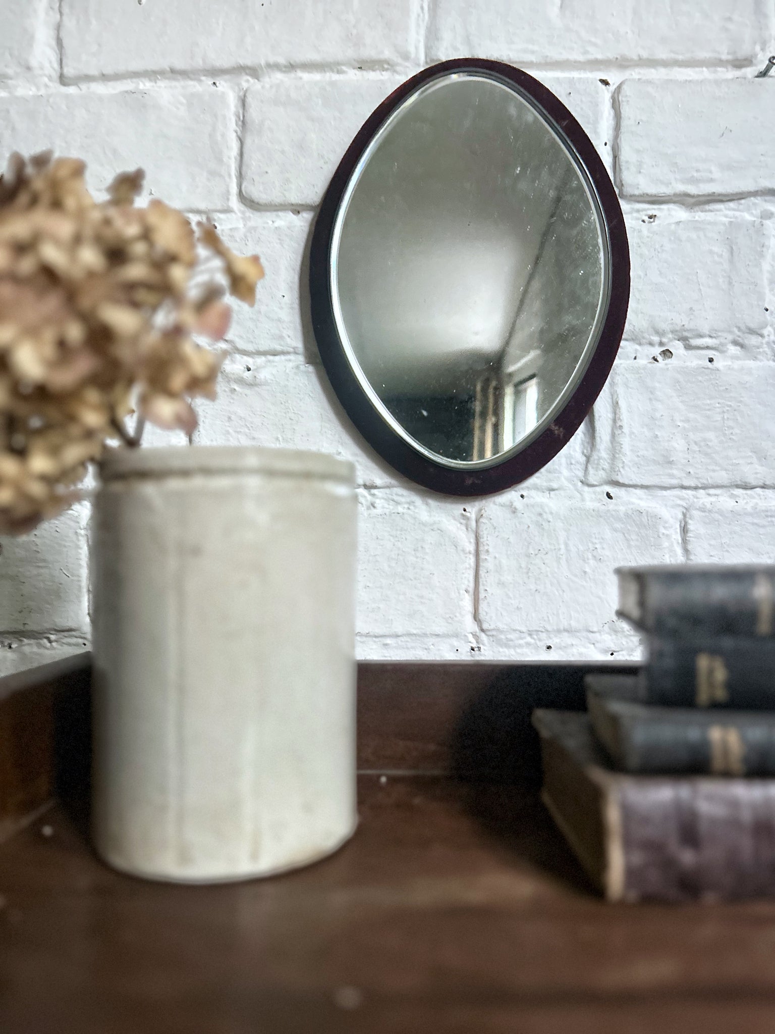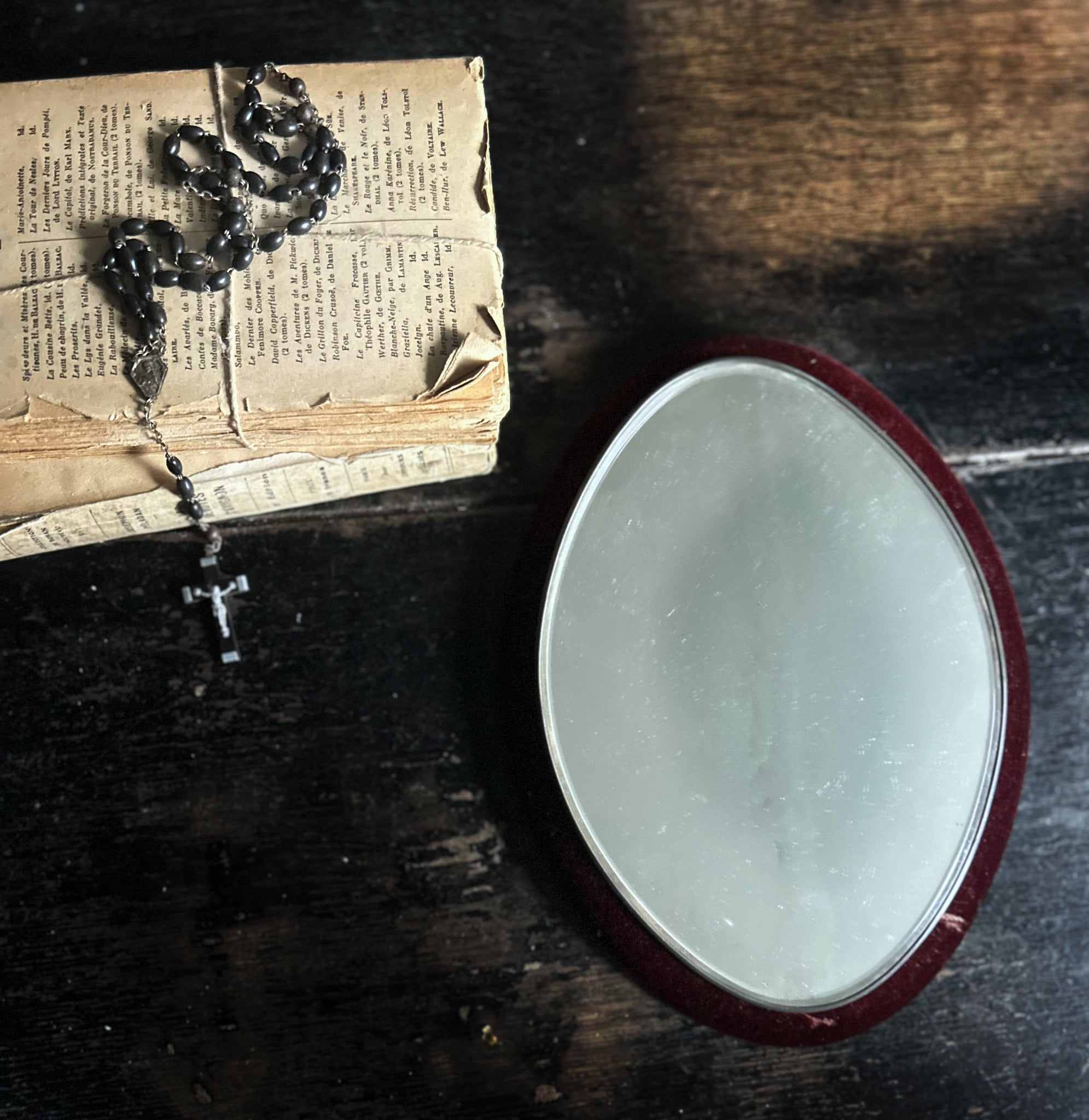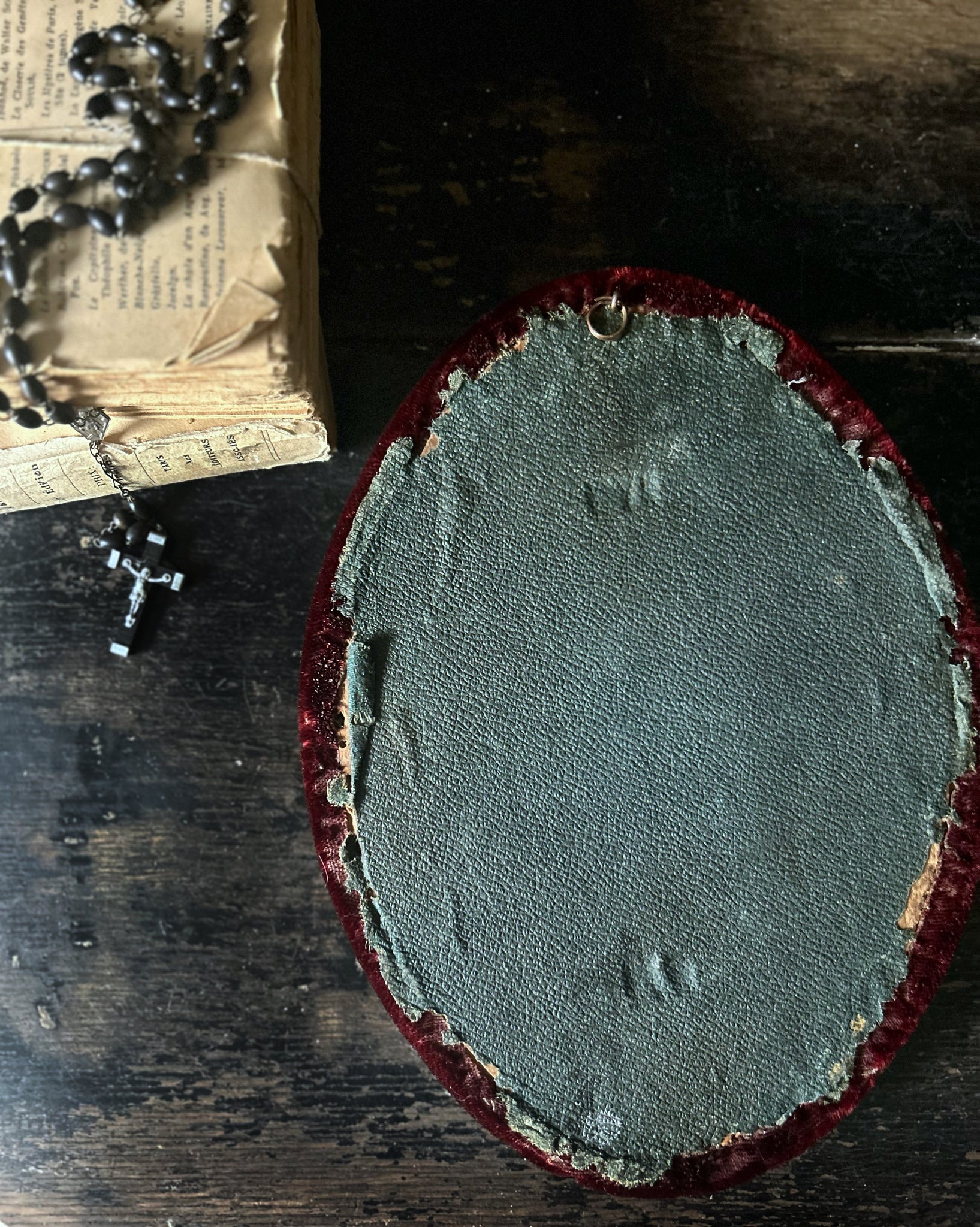 The mirro is set on top of the velvet frame and there is a small ring on the back for hanging.