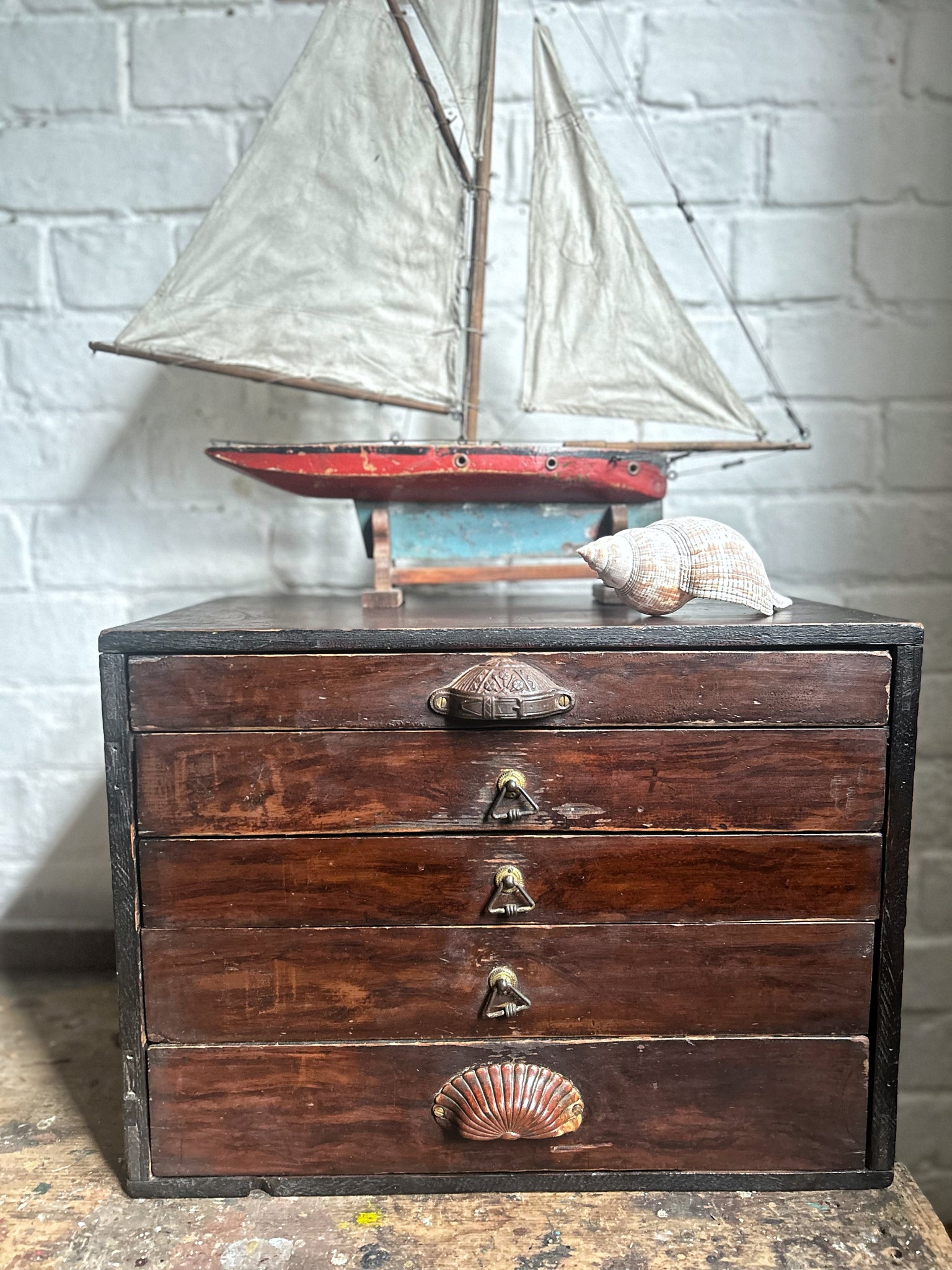 A nice set of antique dark wooden watch makers desk top drawers. The drawers are different depths with mismatched vintage handles and are nice and clean inside.