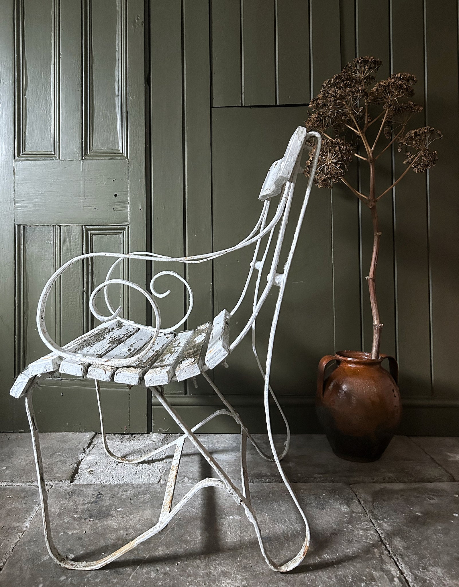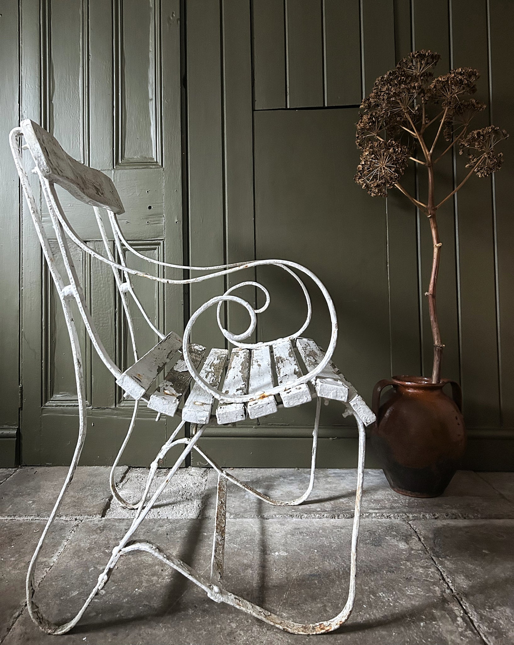 The chair still has the original paint applied which has crackled and flaked over the years, adding to the patina. The wooden slats are solid and the chair is in good pre used condition.