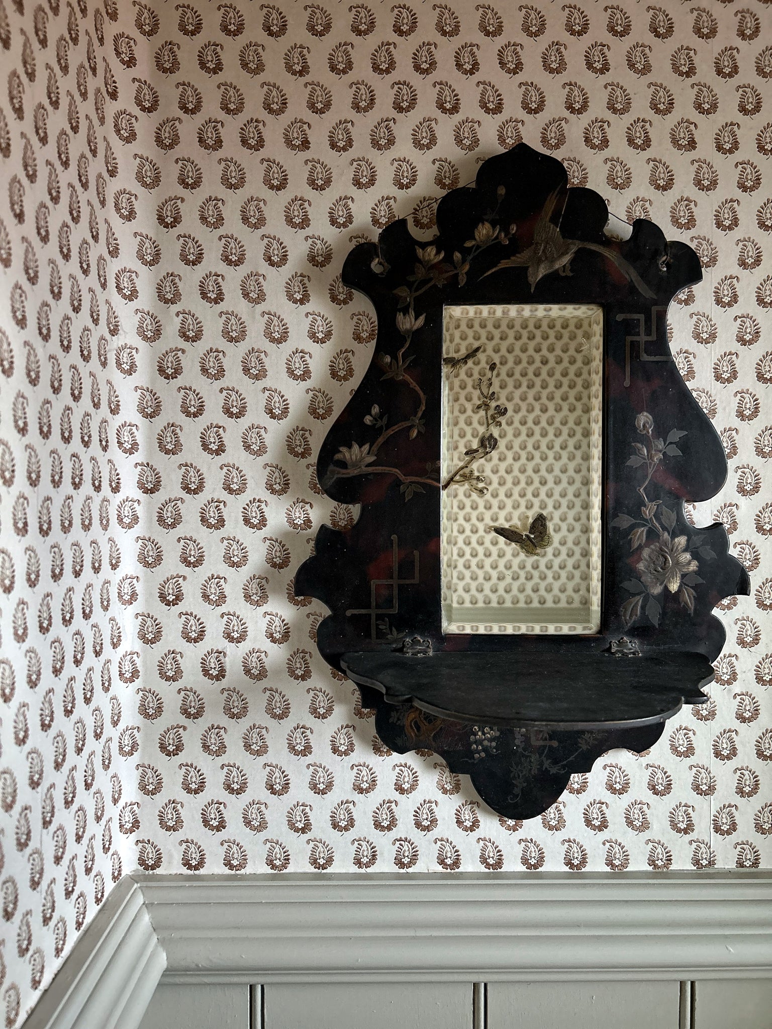 A pretty antique, late 19th Century, papier mache, chinoiserie, hand painted mirror with shelf.