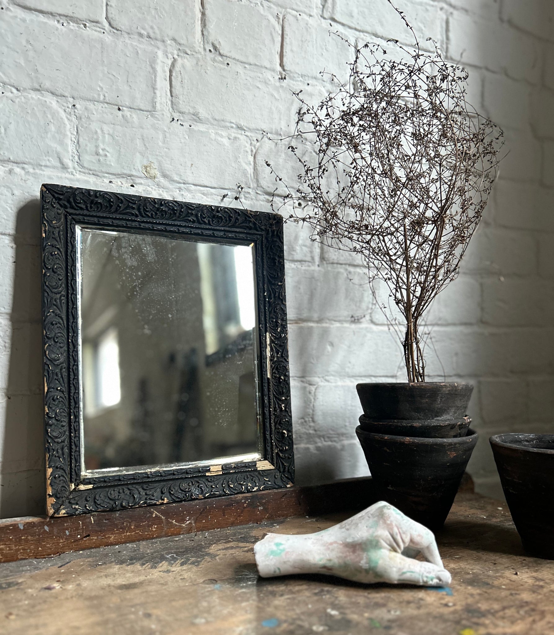 The original bevelled glass is intact and the frame has a nice worn patina with a little damage to partnof the decorative carving in areas.